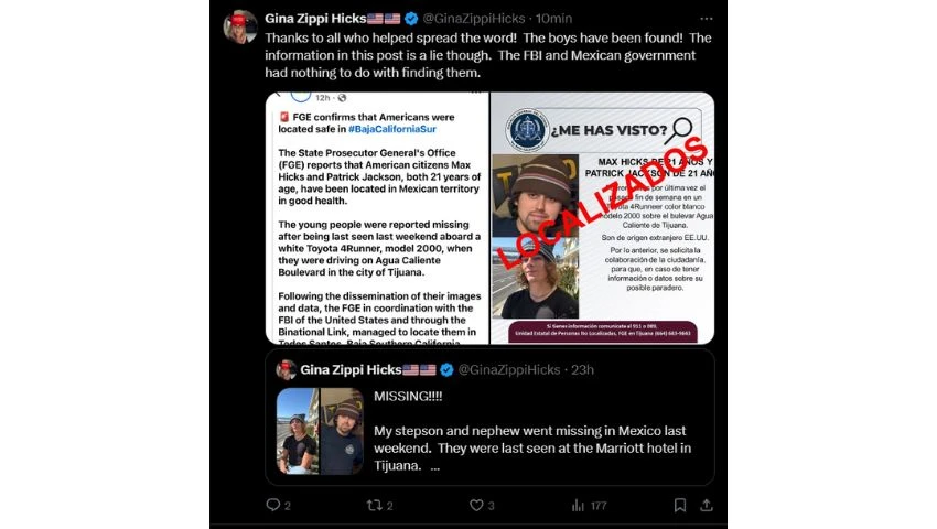 A las 11:20 horas del 18 de marzo de 2025, la Comisión Estatal de Búsqueda de Personas de Baja California informó que Max Hicks y Patrick Jackson han sido localizados con vida y en buen estado de salud.