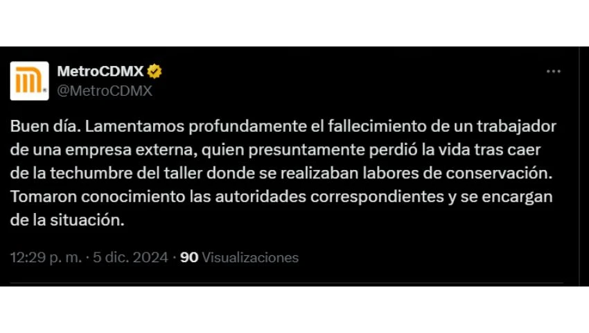 La mañana de este martes 5 de diciembre, un trabajador de una empresa externa perdió la vida al caer desde una altura aproximada de 6 metros mientras realizaba labores de cambio de techado en el taller del Metro de la Ciudad de México (CDMX) ubicado en El Rosario, alcaldía Azcapotzalco. Autoridades de la Secretaría de Seguridad Ciudadana (SSC) y del Sistema de Transporte Colectivo (STC) Metro ya investigan el incidente.