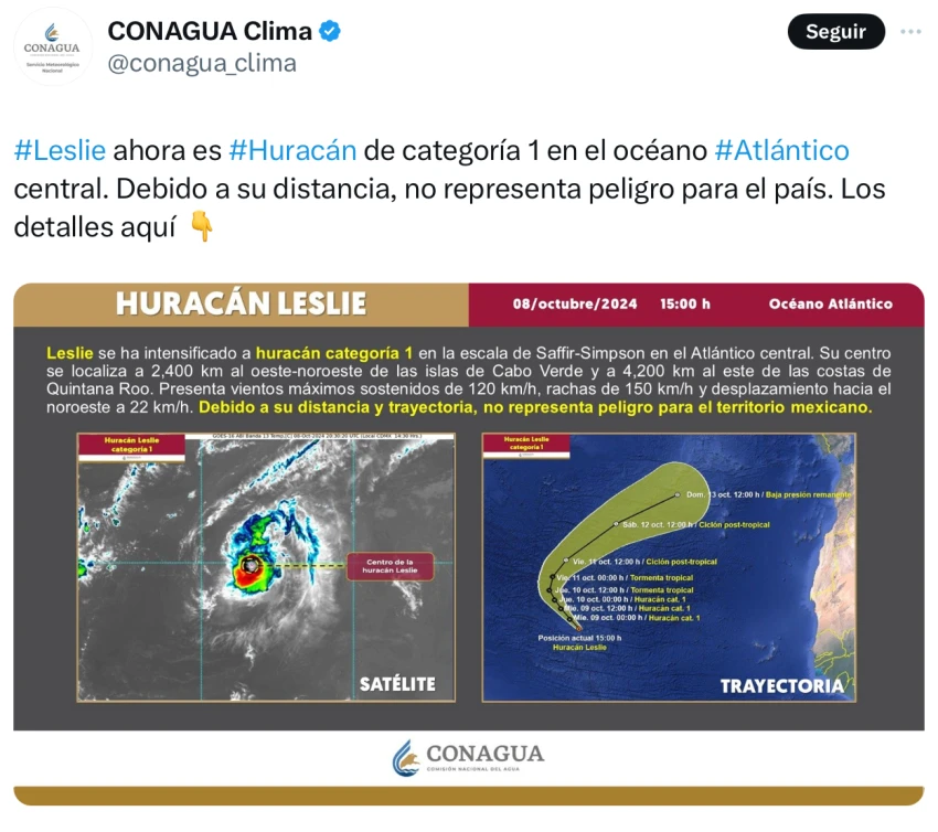 Se prevé que Leslie comience a degradarse hacia tormenta tropical este jueves 10 de octubre, aunque Conagua sigue atenta ante cualquier cambio en su intensidad o trayectoria.