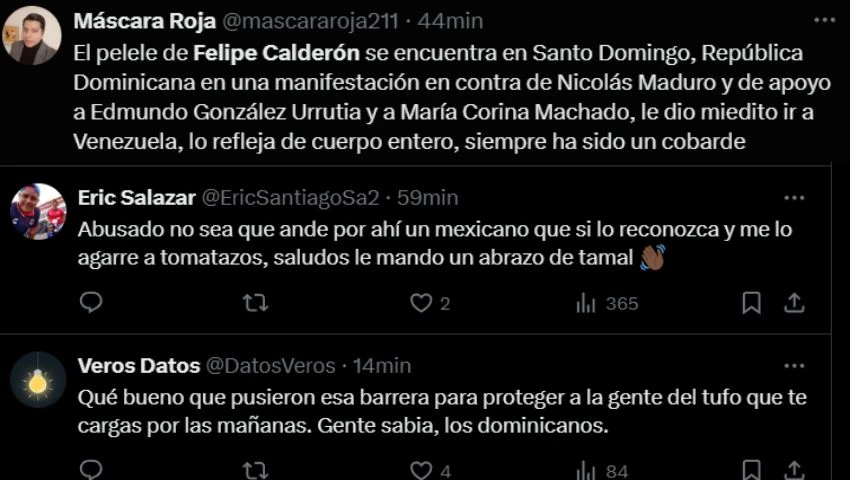 En redes sociales, usuarios se burlaron de Calderón, acusándolo de "no atreverse a ir a Venezuela". Sin embargo, el expresidente decidió sumarse a las protestas en República Dominicana, a pesar de que este 9 de enero coincide con su aniversario de bodas con Margarita Zavala, con quien contrajo matrimonio en 1993.