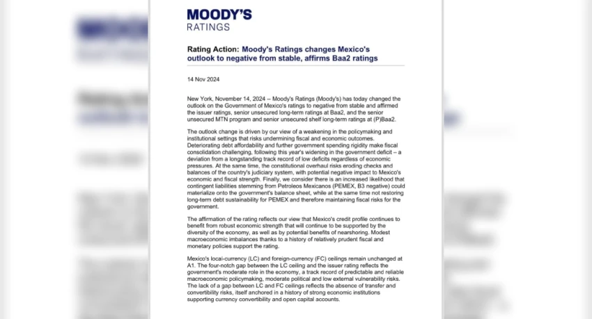 Moody's Ratings (Moody's), la agencia de calificación de riesgo e investigación financiera, cambió la perspectiva respecto a las calificaciones crediticias del gobierno mexicano, pasando de estable a negativa. Esto se debe a un debilitamiento de la formulación de políticas y del entorno institucional.