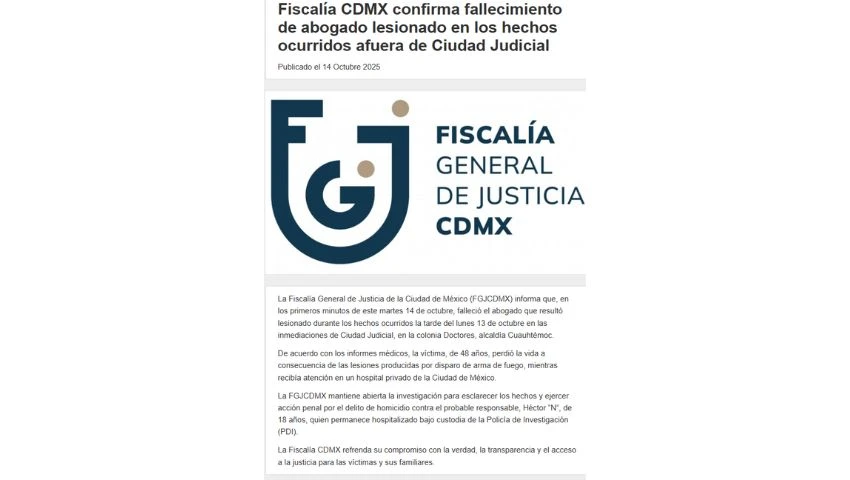 En un primer momento, la FGJCDMX informó el 13 de octubre que el abogado había muerto, pero horas más tarde corrigió la información, indicando que seguía grave. Finalmente, durante la madrugada del martes, el Gobierno de la Ciudad de México confirmó oficialmente su fallecimiento a causa de las heridas de arma de fuego.