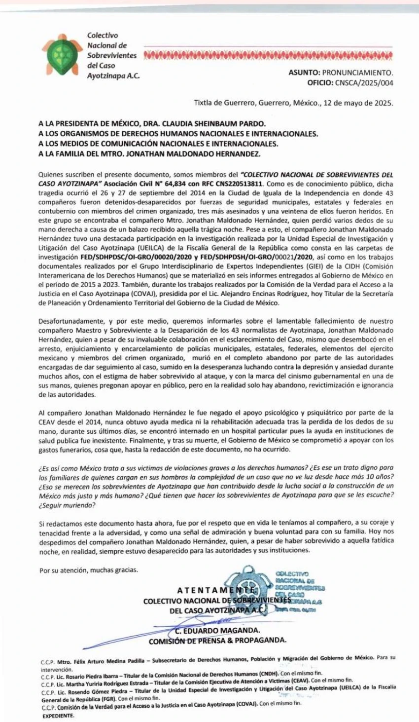 Jonathan Maldonado Hernández, uno de los sobrevivientes del ataque contra los 43 normalistas de Ayotzinapa en Iguala, Guerrero, falleció el pasado 6 de mayo de 2025 en medio de un presunto abandono institucional, según denunció el Colectivo Nacional de Sobrevivientes del Caso Ayotzinapa.