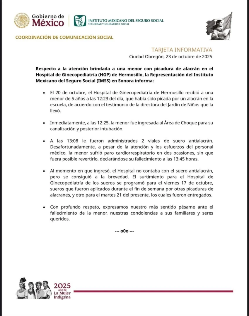 De acuerdo con el IMSS Sonora, los hechos ocurrieron el 20 de octubre, cuando la pequeña fue llevada al hospital por la directora del plantel educativo. Ingresó a las 12:23 horas, fue canalizada e intubada, y a las 13:08 horas recibió dos viales de suero, aunque para entonces su salud ya se había deteriorado gravemente.