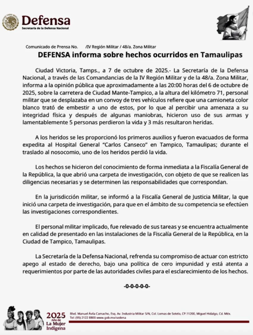 Asimismo, detalló que el personal militar implicado, fue relevado de sus tareas y se encuentra actualmente en calidad de presentado en las instalaciones de la Fiscalía General de la República, en la Ciudad de Tampico, Tamaulipas.
