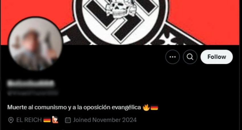 Como si se tratara de un viaje por lo inquietante, al ingresar a la cuenta del atacante, destacan los colores de una bandera neonazi como foto de portada, acompañados por la descripción: “Muerte al comunismo y a la oposición evangélica”.