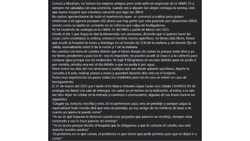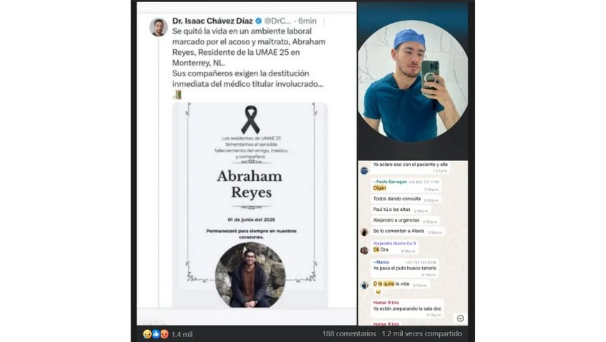 Tras el fallecimiento de Abraham Reyes, médicos residentes del Hospital de Especialidades UMAE 25 del IMSS en Monterrey difundieron un comunicado donde denunciaron el ambiente tóxico que se vive en la institución: acoso, sobrecarga de trabajo, amenazas, humillaciones y abandono institucional.