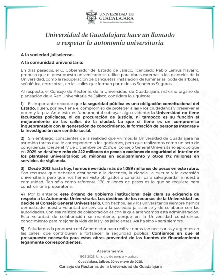 Ante esta propuesta, la Universidad de Guadalajara emitió un comunicado en el que reafirmó que la seguridad pública es una responsabilidad directa del Estado. En el mensaje, la institución aclaró que carece de atribuciones legales en materia de vigilancia, justicia o infraestructura vial, y subrayó que su papel fundamental es la formación académica, la investigación con enfoque social y la generación de conocimiento.