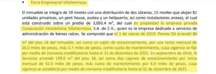 Los documentos oficiales de la ASF señalan que Pemex rentó de 2019 a 2021 un par de pisos del edificio del senador, la Torre Empresarial Villahermosa