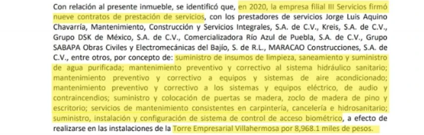 El documento oficial de la Auditoría Superior de la Federación también reveló que la filial III Servicios firmó nueve contratos por 8.9 millones de pesos por concepto de trabajos de mantenimiento, así como por obras e instalaciones realizados en la Torre Empresarial Villahermosa.