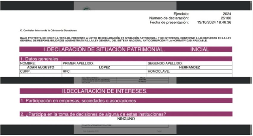 Durante su declaración patrimonial, Adán Augusto López no incluyó a la Organización de Élite y Corporación Inmobiliaria Villahermosa, ya que dejó en blanco el apartado "Participación en empresas, sociedades o asociaciones", aunque en conferencia de prensa aceptó que es accionista.