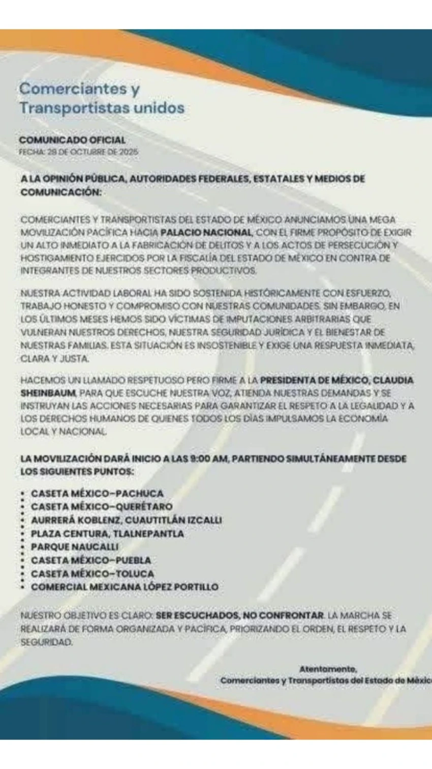 Respecto a la #Movilización de #Transportistas y #Comerciantes, prevista para el miércoles 29 de octubre, y que tendrá como punto de concentración las casetas México-Pachuca, México-Puebla, México-Querétaro, México-Toluca y otros puntos colindantes del… pic.twitter.com/0In4nvdrYs