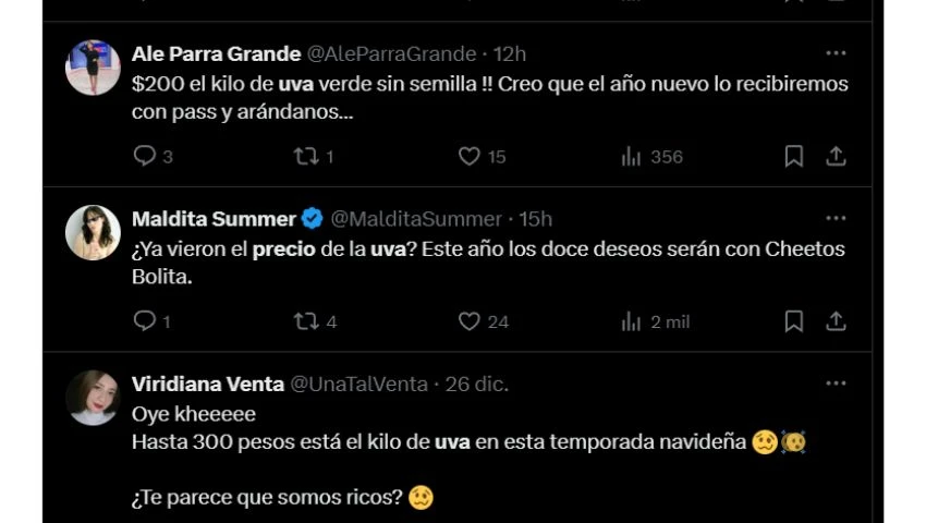 La uva es el símbolo predilecto para despedir el año y recibir el nuevo con 12 deseos. Sin embargo, su precio suele dispararse debido a la alta demanda y su fuera de temporada, ya que su apogeo es en otoño y verano. Este 31 de diciembre, los costos de la uva han generado controversia en redes sociales y medios de comunicación.