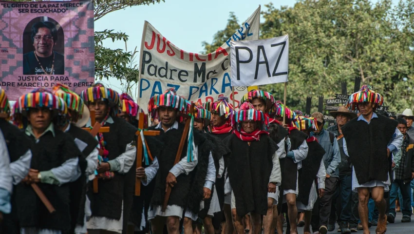 Miles de indígenas de las etnias tzotzil y tzeltal marcharon este domingo en el municipio de Chenalhó, en el estado de Chiapas, para exigir justicia a tres meses del asesinato del padre Marcelo Pérez, para pedir al Gobierno de Claudia Sheinbaum que desarme a los grupos armados y a la delincuencia organizada, que los han desplazado, y para denunciar que la violencia no cesa en sus comunidades.