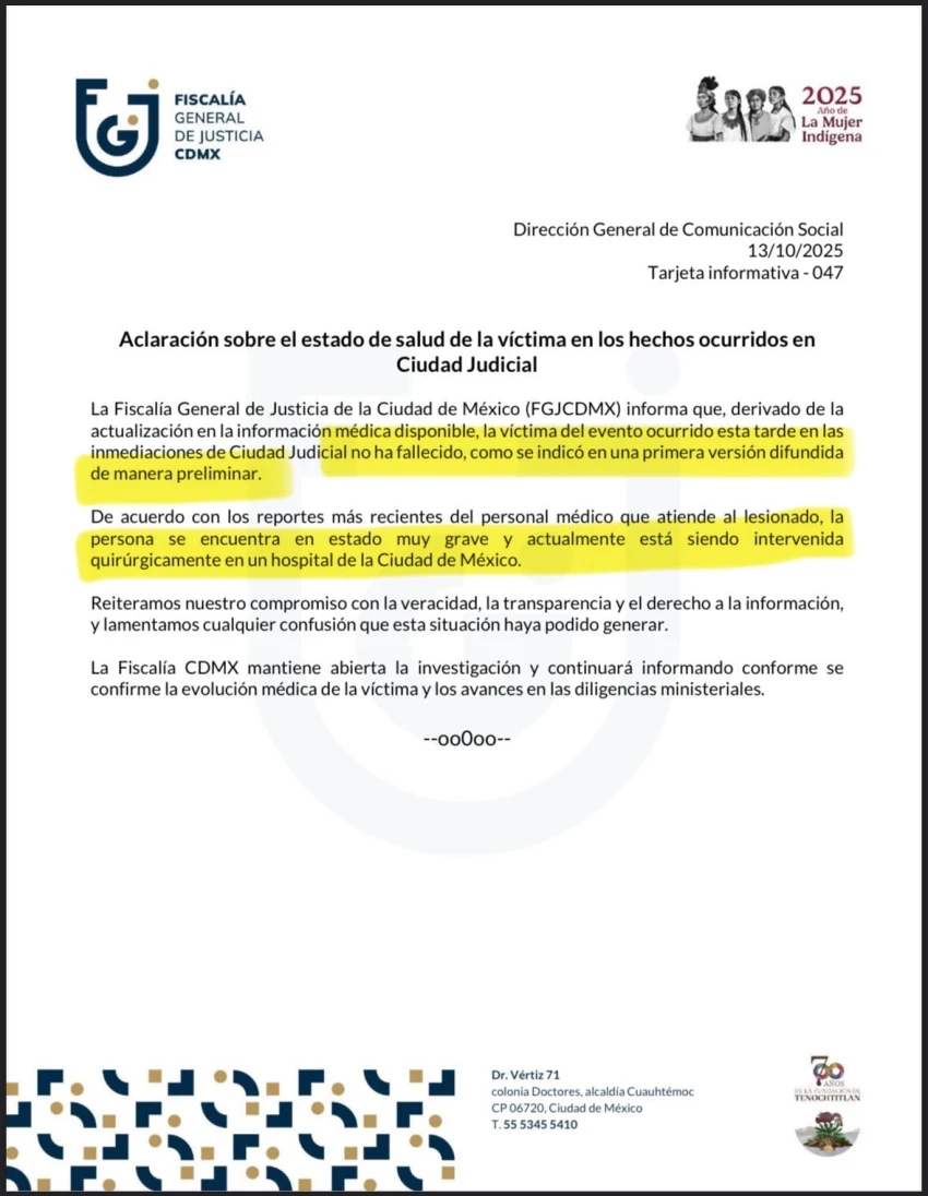 “De acuerdo con los reportes más recientes del personal médico, la víctima está siendo intervenida quirúrgicamente y su estado de salud es delicado”, señaló la FGJCDMX.