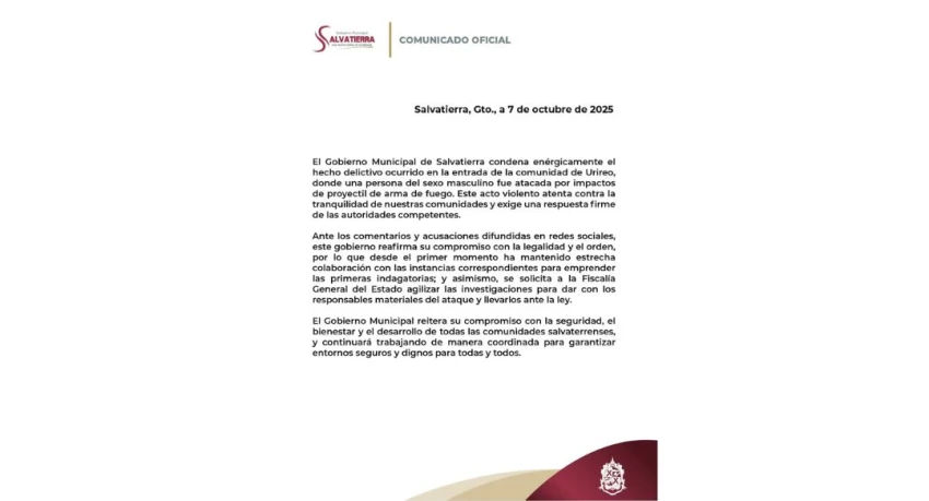 El Gobierno Municipal de Salvatierra emitió un comunicado en el que condenó enérgicamente el hecho delictivo ocurrido en la entrada de la comunidad de Urireo: “Este acto violento atenta contra la tranquilidad de nuestras comunidades y exige una respuesta firme de las autoridades competentes”.