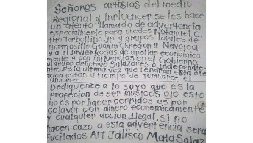 La madrugada del 5 de enero de 2025, se encontró una narcomanta en una preparatoria de Hermosillo, Sonora. En el mensaje, se lanzaron amenazas contra Natanael Cano, Javier Rosas, Tito Torbellino Jr., y otros artistas, acusándolos de apoyar a “Los Salazar”, una facción disidente del Cártel de Sinaloa.