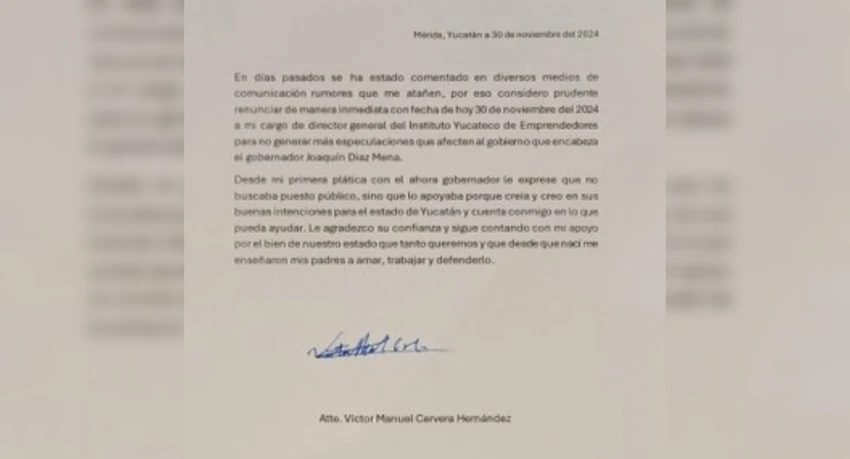 “En días pasados, se han estado comentando en diversos medios de comunicación rumores que me atañen. Por ello, considero prudente renunciar de manera inmediata a mi cargo como director general del Instituto Yucateco de Emprendedores, para no generar más especulaciones que afecten al gobierno que encabeza el gobernador Joaquín Díaz Mena”, expresó el político.