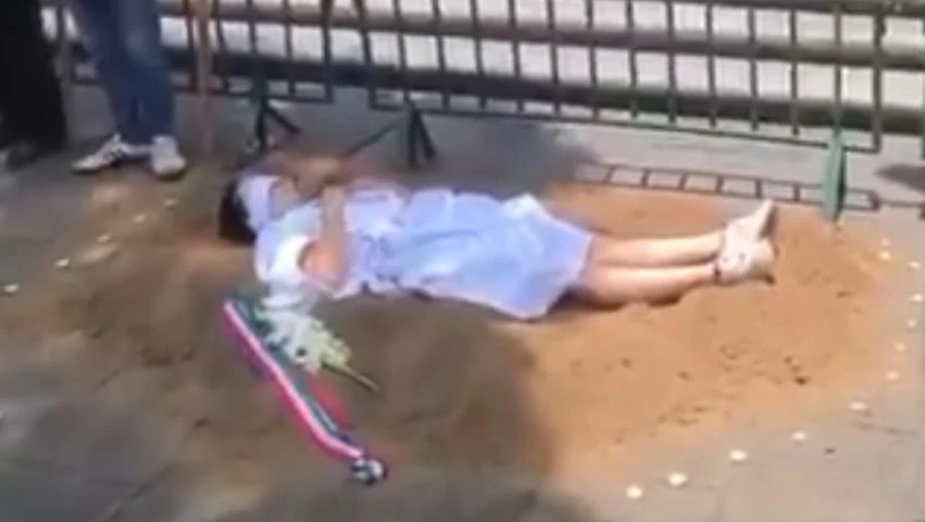 A los pies de las escalinatas del edificio ubicado en avenida Pino Suárez y Circuito Zócalo, se instaló un montículo de tierra con velas blancas, flores y un listón tricolor (con los colores de la bandera mexicana), simulando una sepultura. Además, una mujer vestida como Temis, diosa de la justicia, se recostó junto al altar, reforzando el mensaje de luto.