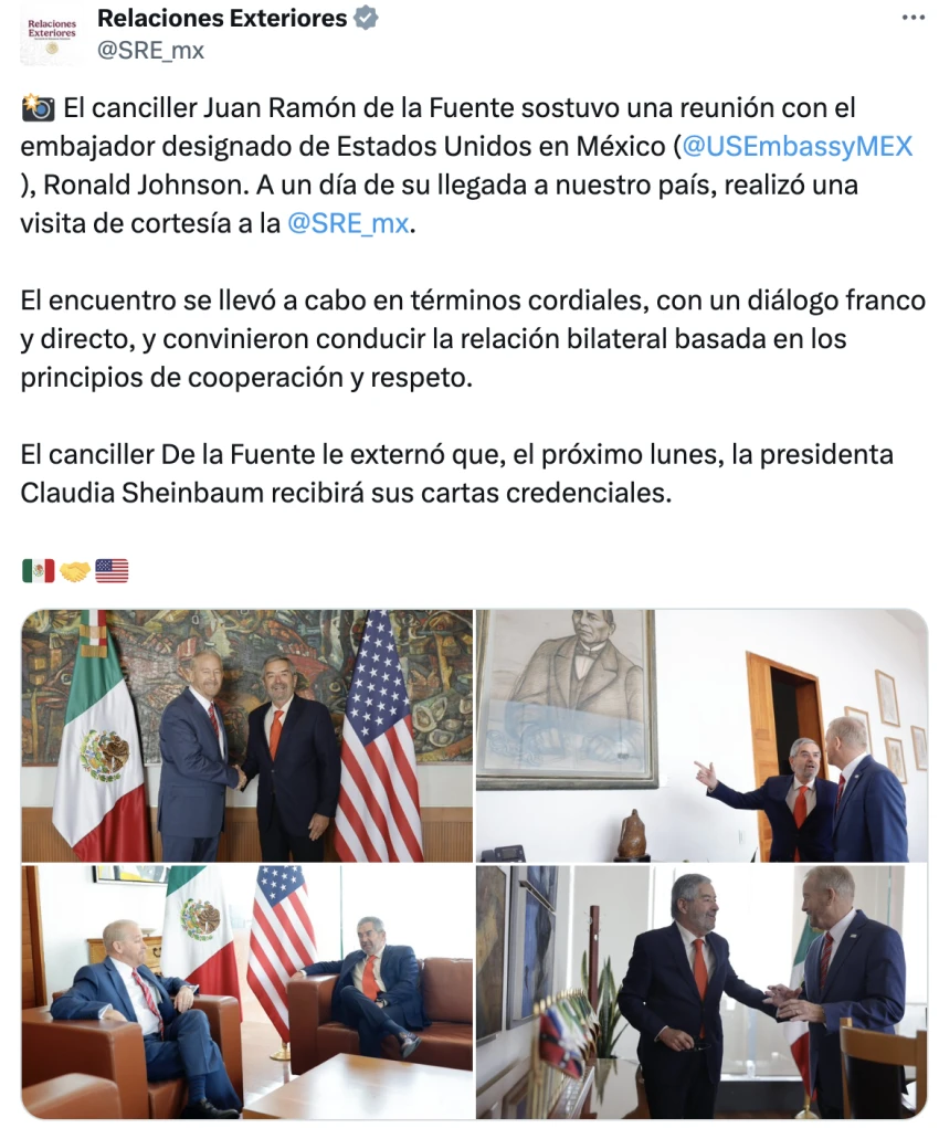 "El canciller Juan Ramón de la Fuente sostuvo una reunión con el embajador designado de Estados Unidos en México Ronald Johnson. A un día de su llegada a nuestro país, realizó una visita de cortesía a la Secretaría de Relaciones Exteriores. El encuentro se llevó a cabo en términos cordiales, con un diálogo franco y directo, y convinieron conducir la relación bilateral basada en los principios de cooperación y respeto", se lee en un comunicado compartido por la SRE.