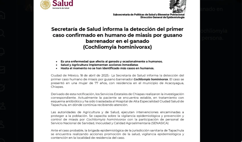 La Secretaría de Salud de México confirmó este jueves el primer caso humano de miasis por gusano barrenador del ganado (Cochliomyia hominivorax), una enfermedad que generalmente afecta a animales pero que en raras ocasiones puede presentarse en personas.
