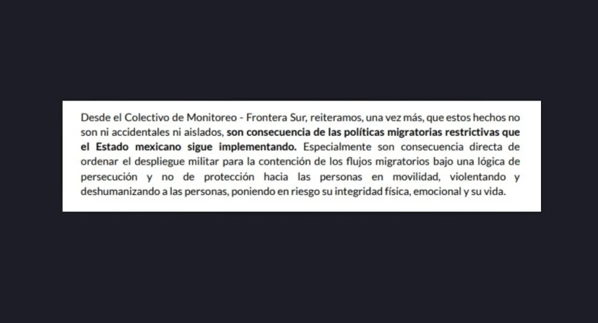 Las autoridades no revelaron de manera inmediata la identidad de las víctimas; el Colectivo de Monitoreo- Frontera Sur emitió un comunicado donde mencionó que entre los muertos, se encontraban cuatro hombres, una niña y una joven. La organización también aprovechó para dar un mensaje sobre las políticas migratorias implementadas por el gobierno nacional.