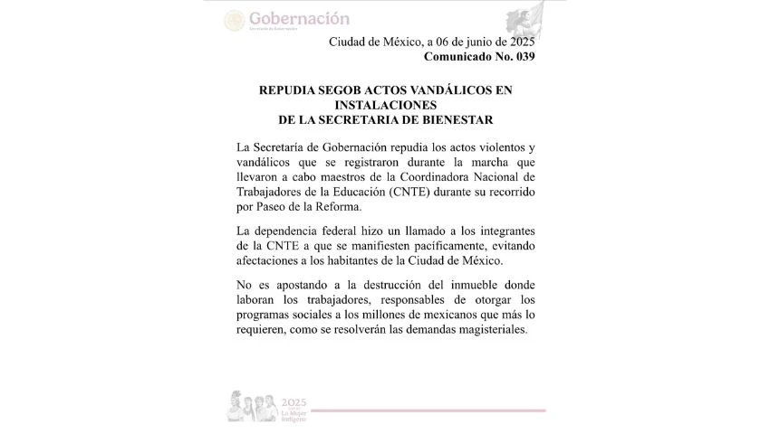 Tras estos incidentes, la Secretaría de Gobernación (Segob) emitió un comunicado en el que repudió los actos violentos y vandálicos registrados durante la marcha del magisterio disidente. La dependencia federal hizo un llamado directo a los integrantes de la CNTE a manifestarse de manera pacífica, sin afectar a los habitantes de la Ciudad de México ni dañar espacios públicos.