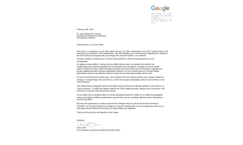 La controversia surgió después de que Google publicara una carta, enviada el 10 de febrero al canciller mexicano, Juan Ramón de la Fuente, en la que defendía la modificación. La carta argumentaba que el cambio era coherente con una actualización del Sistema de Información de Nombres Geográficos de Estados Unidos (GNIS), resultado del decreto emitido por Trump el 20 de enero, que solo afecta a la plataforma continental de Estados Unidos.