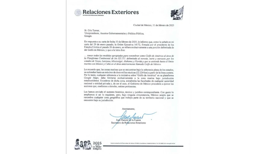 Además, mostró una carta enviada por el canciller mexicano el 11 de febrero, en respuesta a la contestación de Google, en la que se deja claro que México no aceptará que se renombre ninguna zona geográfica que incluya parte de su territorio. El texto también subraya que cualquier referencia al "Golfo de América" en Google Maps debe limitarse exclusivamente a la zona bajo jurisdicción estadounidense.