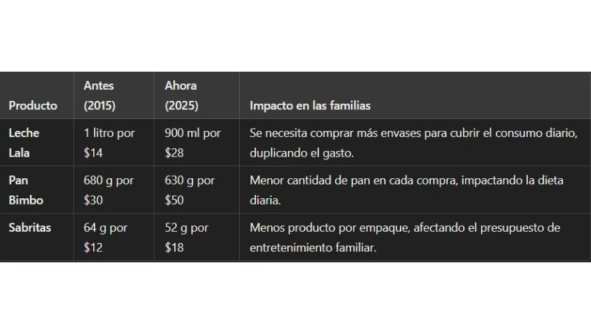 Las familias necesitan reponer productos básicos con mayor frecuencia porque las cantidades han disminuido, lo que incrementa el gasto mensual. Por ejemplo, una bolsa de leche que antes rendía para varios días ahora tiene menos contenido, forzando compras más frecuentes.