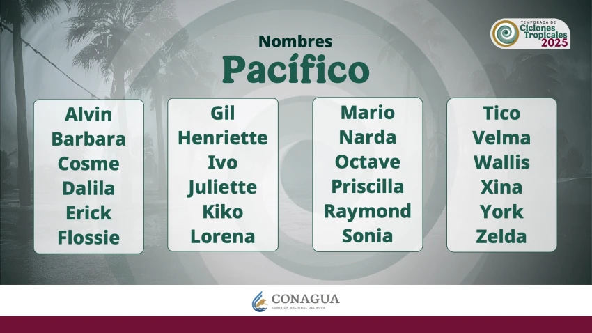 Para este 2025, en el Pacífico se prevén 20 sistemas que podrían llegar a se huracanes, los cuales son: Alvin, Bárbara, Cosme, Dalila, Erick, Flossie, Gil, Henriette, Ivo, Juliette, Kiko, Lorena, Mario, Narda, Octava, Priscilla, Raymond, Sonia, Tico, Velma, Wallis, Xina, York y Zelda.