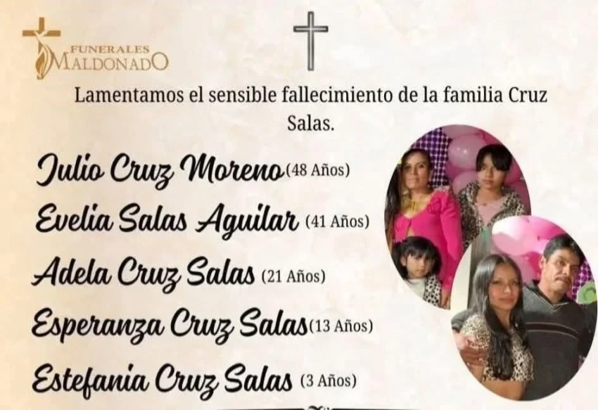 La familia Cruz Salas era conformada por Julio de 40 años, Evelia de 41 años, Adela de 21 años, Esperanza de 13 años y Estefanía de 3 años.