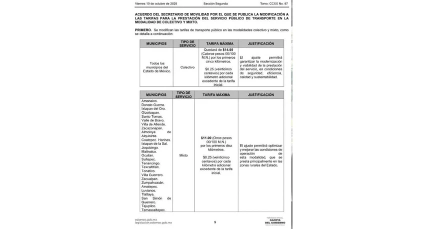 A partir del 15 de octubre, viajar en transporte público dentro del Estado de México costará dos pesos más: la tarifa mínima subirá de 12 a 14 pesos para los primeros cinco kilómetros. El incremento, equivalente a un 17 %, fue autorizado por la Secretaría de Movilidad y publicado en la Gaceta de Gobierno.