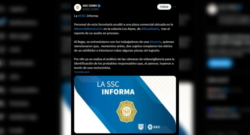La Secretaría de Seguridad Ciudadana de la Ciudad de México (SSC-CDMX) informó a través de un comunicado en las redes sociales, que sus elementos acudieron a la plaza tras el reporte de un asalto en proceso.