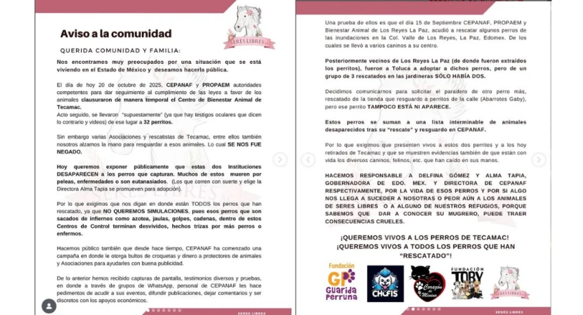 La organización Seres Libres A.C. pidió garantías de seguridad para sus integrantes y transparencia total sobre el destino de los animales retirados por las autoridades.