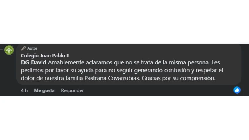 “Amablemente aclaramos que no se trata de la misma persona. Les pedimos por favor su ayuda para no seguir generando confusión y respetar el dolor de nuestra familia Pastrana Covarrubias. Gracias por su comprensión”, publicó el colegio en redes.