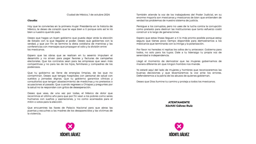 En su misiva, Gálvez señala: "Deseo de todo corazón que te vaya bien en tu gobierno". A su vez, exhorta a Sheinbaum a dejar atrás lo que califica como una "elección de Estado" y le pide gobernar con transparencia.