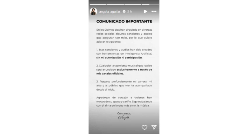 “En los últimos días, han circulado en diversas redes sociales algunas canciones y audios que aseguran son míos, por lo que quiero aclarar lo siguiente: Esas canciones y audios han sido creados con herramientas de Inteligencia Artificial, sin mi autorización ni participación", se lee en la primera parte del comunicado.
