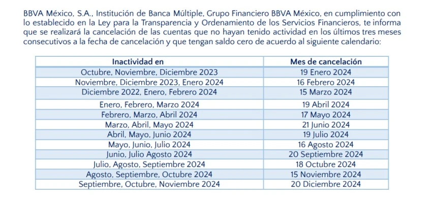 En cumplimiento con la Ley para la Transparencia y Ordenamiento de los Servicios Financieros, BBVA México anunció a principios de año un calendario para la cancelación de cuentas sin actividad, con saldo cero, que cubre hasta diciembre de 2024. Las cuentas que no han tenido movimientos en los últimos tres meses serán eliminadas de acuerdo con las fechas establecidas.