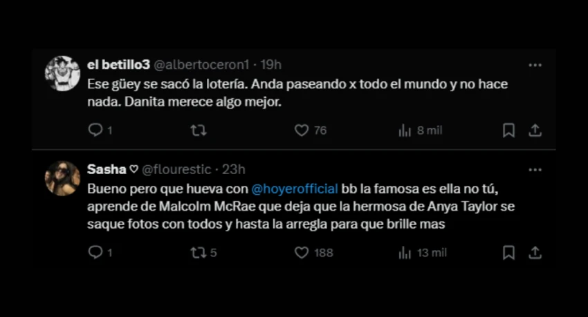 Aunque ambos mantuvieron una actitud sonriente durante el encuentro, para muchos usuarios fue evidente que Alex Hoyer estaba incómodo con la atención que recibía su pareja. Así, las críticas no tardaron en inundar las redes sociales, con comentarios como: