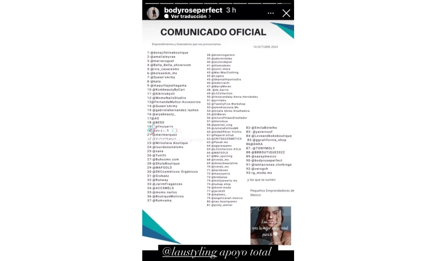 "Por este medio, queremos pronunciarnos y reiterar nuestro apoyo rotundo a Laura Stylist debido a los sucesos acontecidos tras los comentarios de uno de los finalistas de 'La Casa de los Famosos México 2024', sobre los emprendimientos y diseñadores mexicanos que, con mucho cariño, esfuerzo y dedicación, les hicimos llegar a través de Laura Stylist algunas de nuestras prendas o productos."