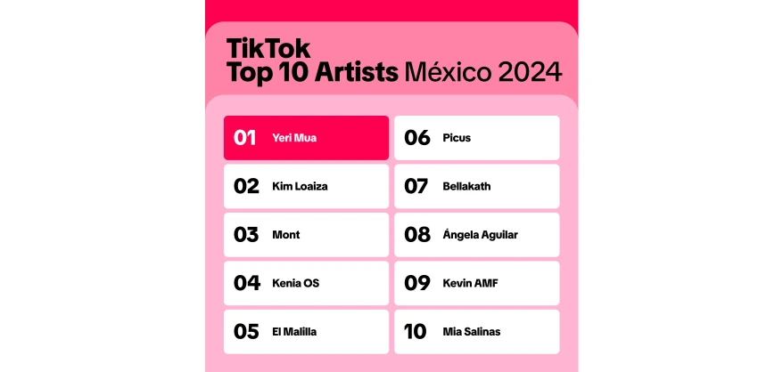 Entre los datos que dio a conocer TikTok, está su top 10 de los cantantes más escuchados en México y a nivel mundial. Para sorpresa de muchos, por segundo año consecutivo, la artista más escuchada en el mundo fue una mexicana, y se trató de Yeri Mua, quien lideró la lista gracias al éxito viral de su tema Línea del Perro. En el ranking global también sobresalió la mexicana Kimberly Loaiza, colocándose en el lugar número 8.