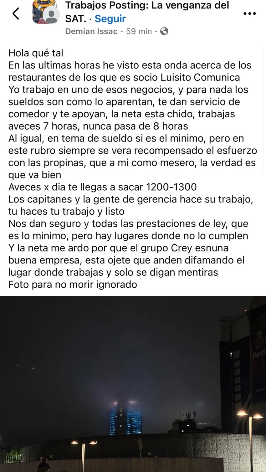 "En las ultimas horas he visto esta onda acerca de los restaurantes de los que es socio Luisito Comunica. Yo trabajo en uno de esos negocios y para nada los sueldos son como lo aparentan. Te dan servicio de comedor y te apoyan, la neta esta chido, trabajas aveces 7 horas, nunca pasa de 8 horas. Al igual, en tema de sueldo si es el mínimo, pero en este rubro siempre se vera recompensado el esfuerzo con las propinas, que a mi como mesero, la verdad es que va bien", escribió el usuario identificado como Demian Isaac.