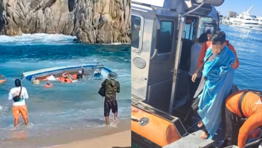 Un fuerte oleaje y ráfagas de viento sorprendieron a un grupo de 5 turistas a bordo de una embarcación en la Playa del Amor, en Cabo San Lucas, Baja California. Minutos después, la embarcación volcó, lo que activó una rápida respuesta por parte de los prestadores de servicios náuticos, quienes realizaron maniobras de rescate para evitar que los pasajeros sufrieran lesiones de gravedad.