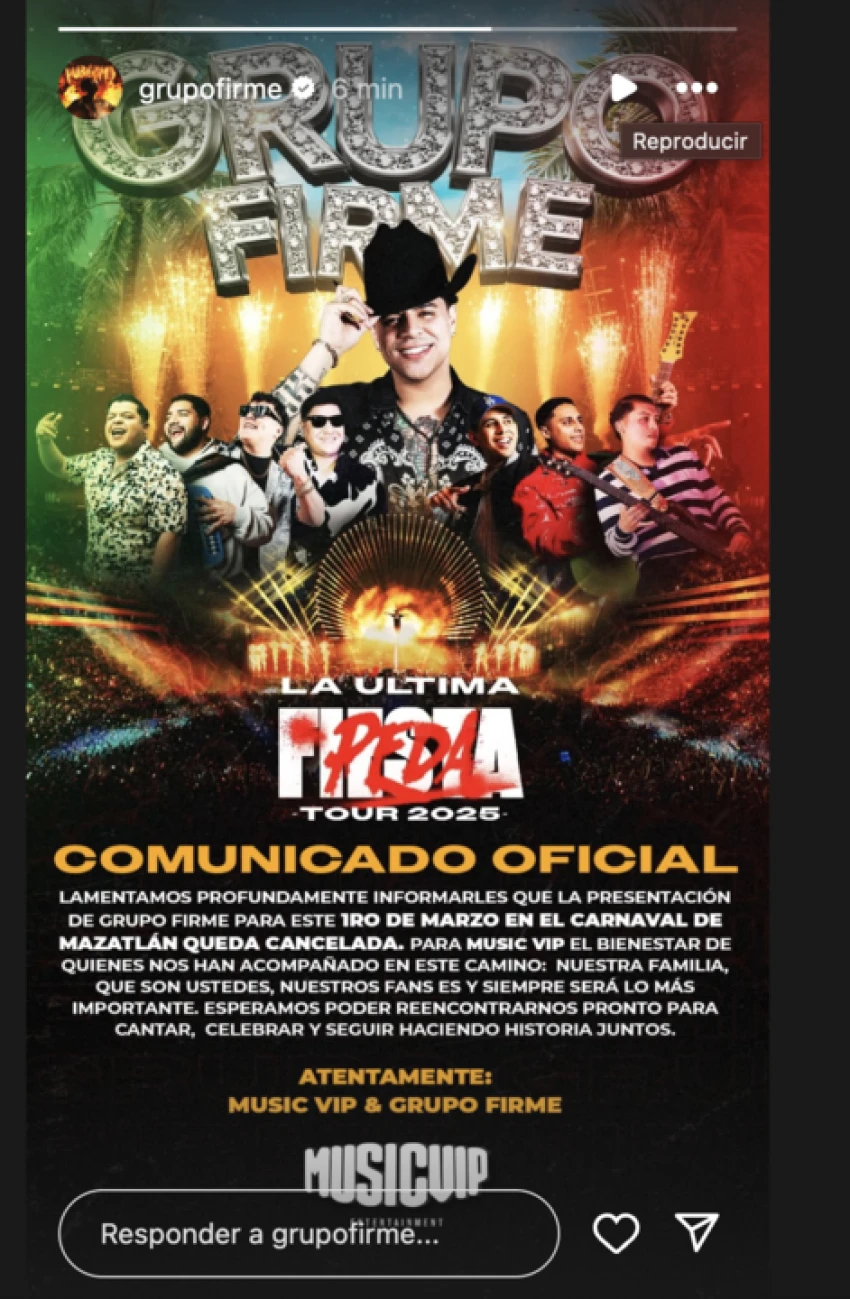 "Lamentamos profundamente informarles que la presentación de Grupo Firme para este 1ro de marzo en el Carnaval de Mazatlán queda cancelada. Para music vip el bienestar de quienes nos han acompañado en este camino: nuestra familia, que son ustedes, nuestros fans es y siempre será lo más importante esperamos poder reencontrarnos pronto para cantar, celebrar y seguir haciendo historia juntos", se lee en el texto compartido en redes sociales.