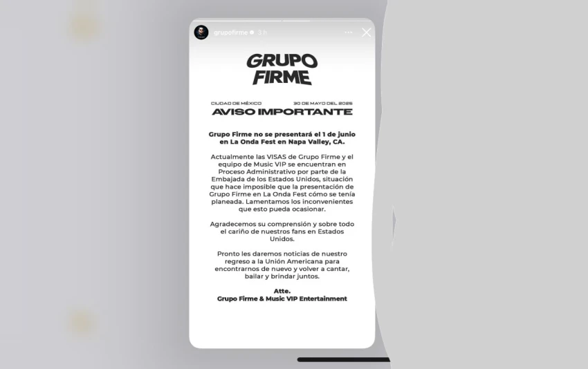 El grupo de regional mexicano Grupo Firme anunció la cancelación de su presentación en el festival La Onda Fest, programada para el 1 de junio en Napa Valley, California, debido a problemas con sus visas de trabajo para Estados Unidos.