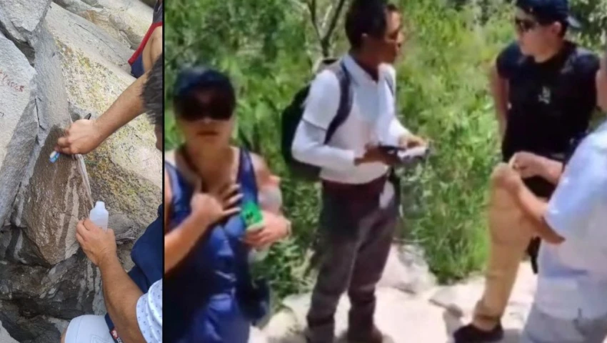 Una pareja de turistas estadounidenses fue sorprendida vandalizando con plumón la Peña de Bernal, en el municipio de Ezequiel Montes, Querétaro, uno de los monolitos más grandes de Latinoamérica. El incidente fue documentado en video y se viralizó rápidamente en redes sociales, lo que permitió la identificación de los responsables.