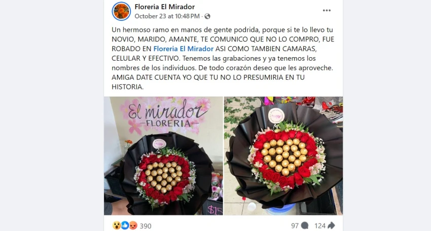 "Un hermoso ramo en manos de gente podrida, porque si te lo llevó tu NOVIO, MARIDO, AMANTE, TE COMUNICO QUE NO LO COMPRÓ, FUE ROBADO EN florería 'El Mirador' ASÍ COMO TAMBIÉN CÁMARAS, CELULAR Y EFECTIVO. Tenemos las grabaciones y ya tenemos los nombres de los individuos. De todo corazón deseo que les aproveche. AMIGA DATE CUENTA YO QUE TÚ NO LO PRESUMIRÍA EN TU HISTORIA", escribieron los dueños de la florería en su cuenta de Facebook.