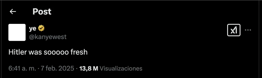 El cantante además realizó varias publicaciones cargadas de odio, entre ellas hacia el dueño de la plataforma X, Elon Musk, y la comunidad judía, e incluso aseguró que "amaba a Hitler" y que era nazi.