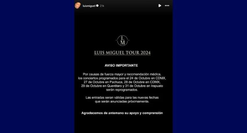 Jueves 24 de octubre. Luis Miguel dio la noticia de que varias fechas de su gira serían pospuestas debido a una recomendación médica, motivo que entristeció a sus fans.